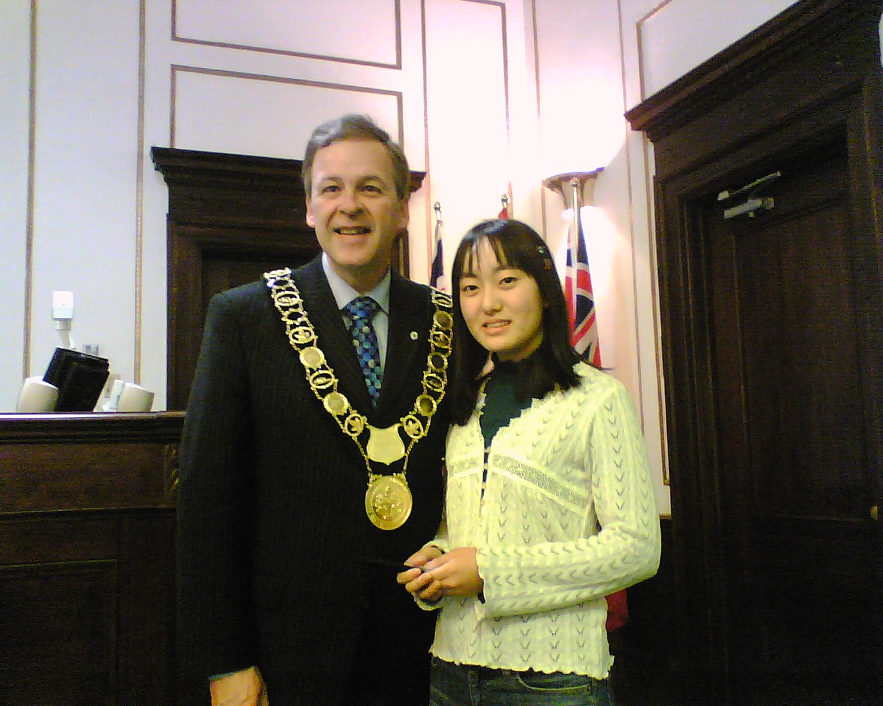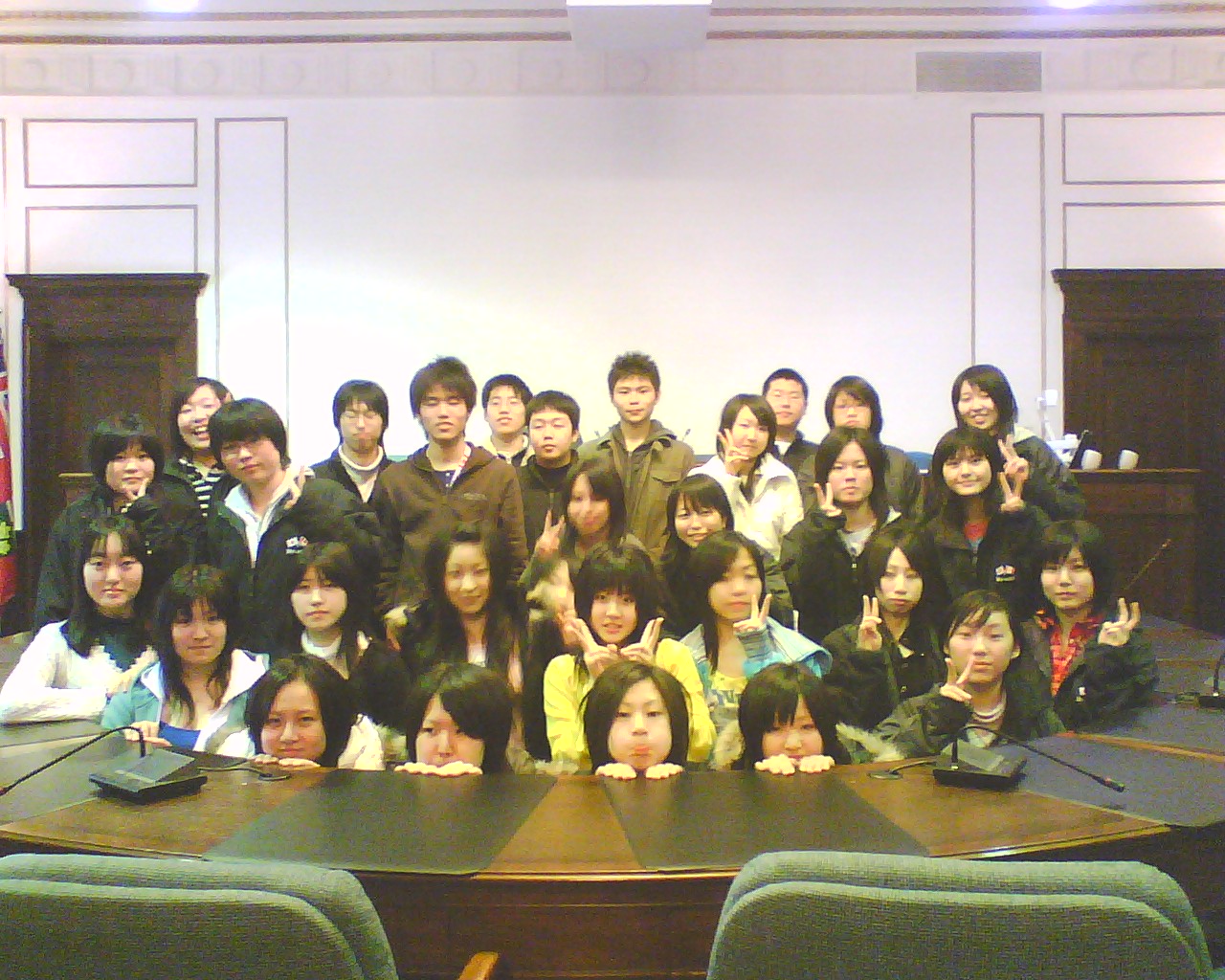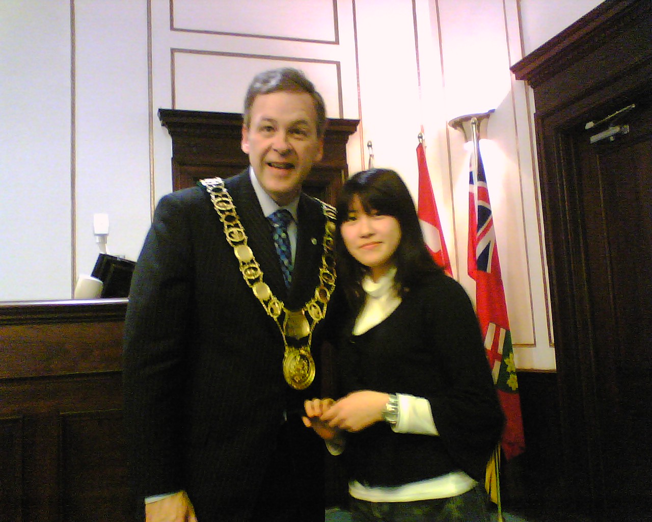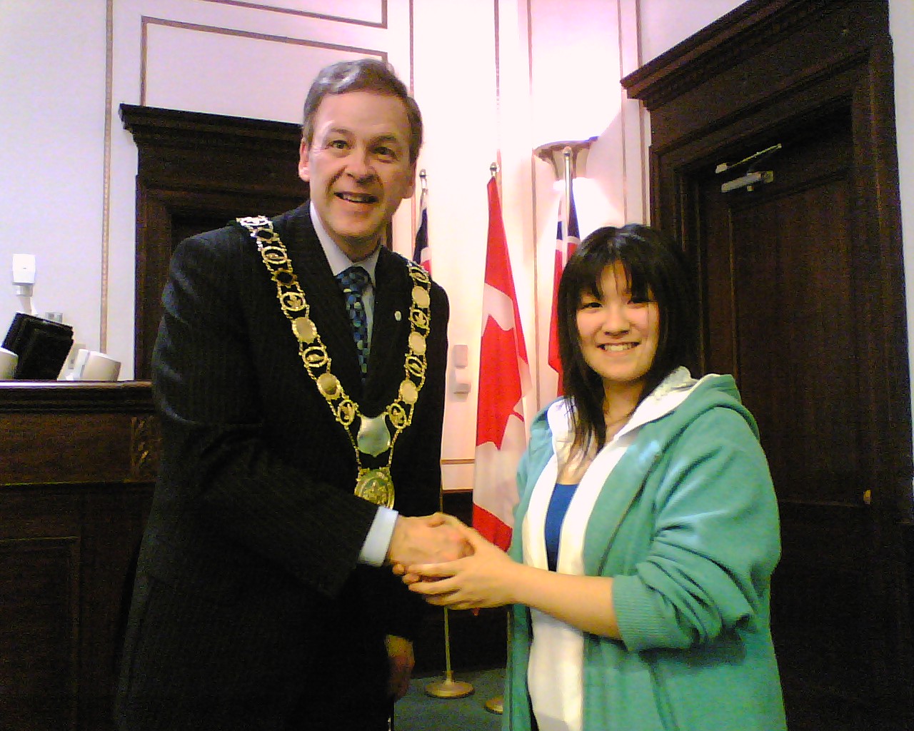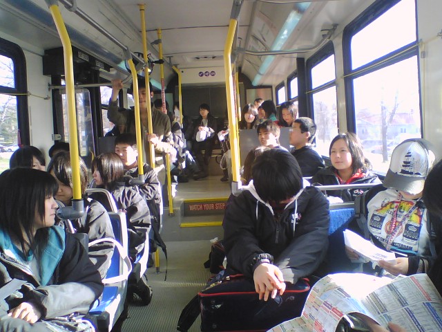 残りは宿題となりました。 放課後は、各自バスターミナルに集合し、セントキャサリンズの市庁舎 に市長を訪問しました。市長の Brian McMullan さんは、今年着任した ばかりの方でしたが、とても優しく思いやり深く北海生に接していただき ました。 記念品として、生徒一人一人にセントキャサリンズの市名が刻 まれたボールペンとバッジが市長の手から渡されました。 また、お別れの前に、市長さんから、「大変素晴らしい生徒たちです」と お褒めの言葉をいただき、日本語で「サヨナラ」の言葉を贈っていただき ました。 バスターミナルで13:40頃、一度解散し、再度6:15にペン・センターの 映画館前に集合し、七つの映画の中から好みの映画を選び、終了次第 解散という形をとりました。 ホストファミリーが迎えに来る場合もあれば、 各自バスを利用し帰宅しました。 終了時間は、概ね9:00でした。 市長さんとお会いする前の ひと時 私は緊張していましたが、 生徒たちは、意外に落ち着 いています。 こうして一人一人握手をして 記念品が手渡されました。 舟橋江梨伽 握手は、手をしっかり握るのが 大切な礼儀です。 高木理沙 斉藤隆馬は、少々緊張気味 鈴木悠希は、市長さんに 気に入られたようです。 岡部彩華は、いかにも 嬉しそう 何か、親子の雰囲気 斉藤愛菜 いつも落ち着いています。 戸田智美 どちらが年長? Meg 先生 かなりブレました。 ゴメン 議長席の前に 全員集合 ちゃっかり議長席に 鈴木悠希 議長?を囲んで 市庁舎前で 映画は、字幕が無いので楽しめたかどうか。 明日は、希望者のみ9:00から中心街でショッピングをすることに なっています。大半が希望しました。 10:00に全員集合して、メイプル・シュガーの森を散歩したり、メイ プルシロップ製品のショッピングをする予定です。 ※ 市長を訪問した時の反省として、対市長さんへの贈り物として何 か適当な物を考えておくべきだと思いました。 今回は、北海のマ ークの入ったキーホルダーを差し上げたのですが、市長からの もてなしからして、適切ではなかったようにも思えました。