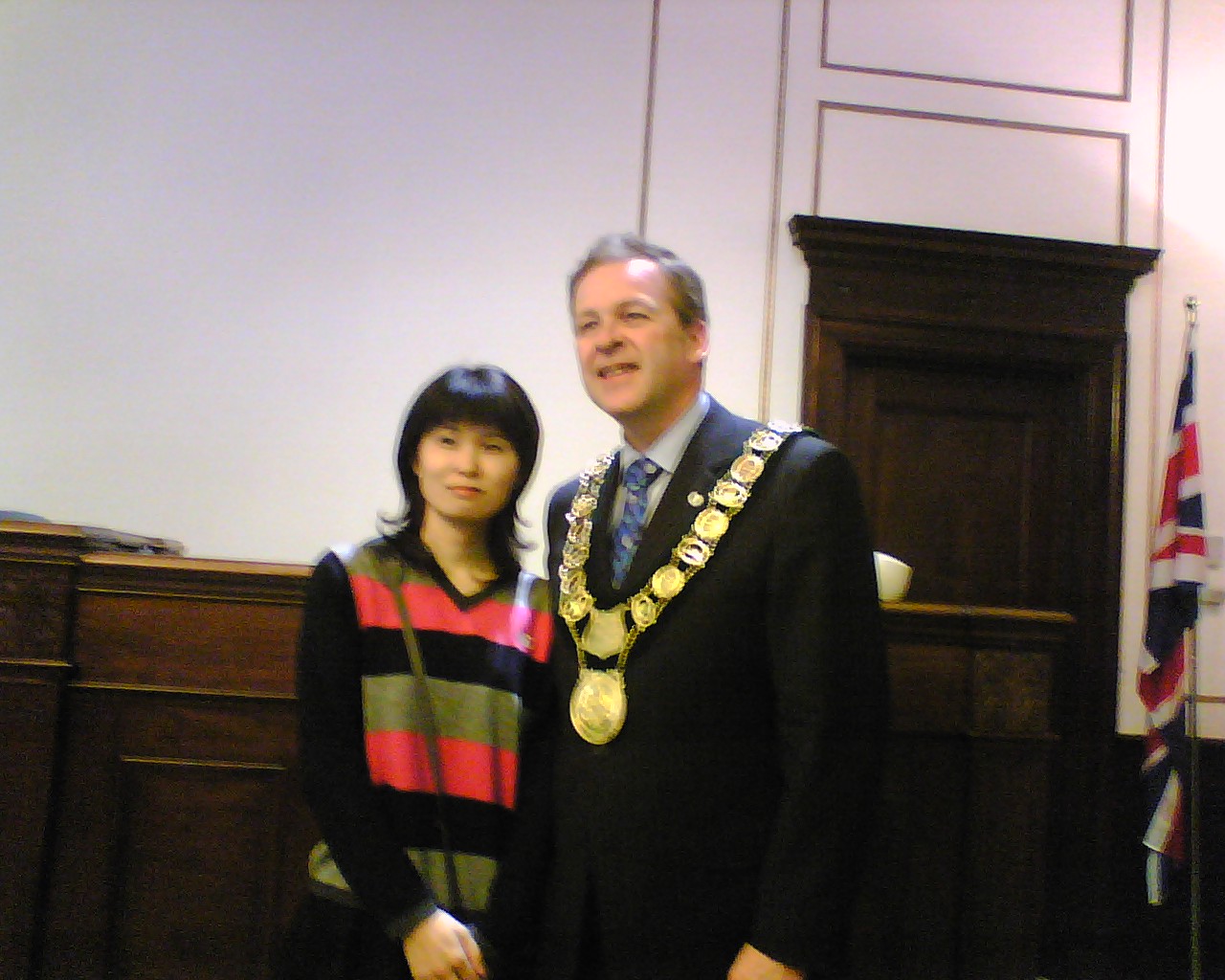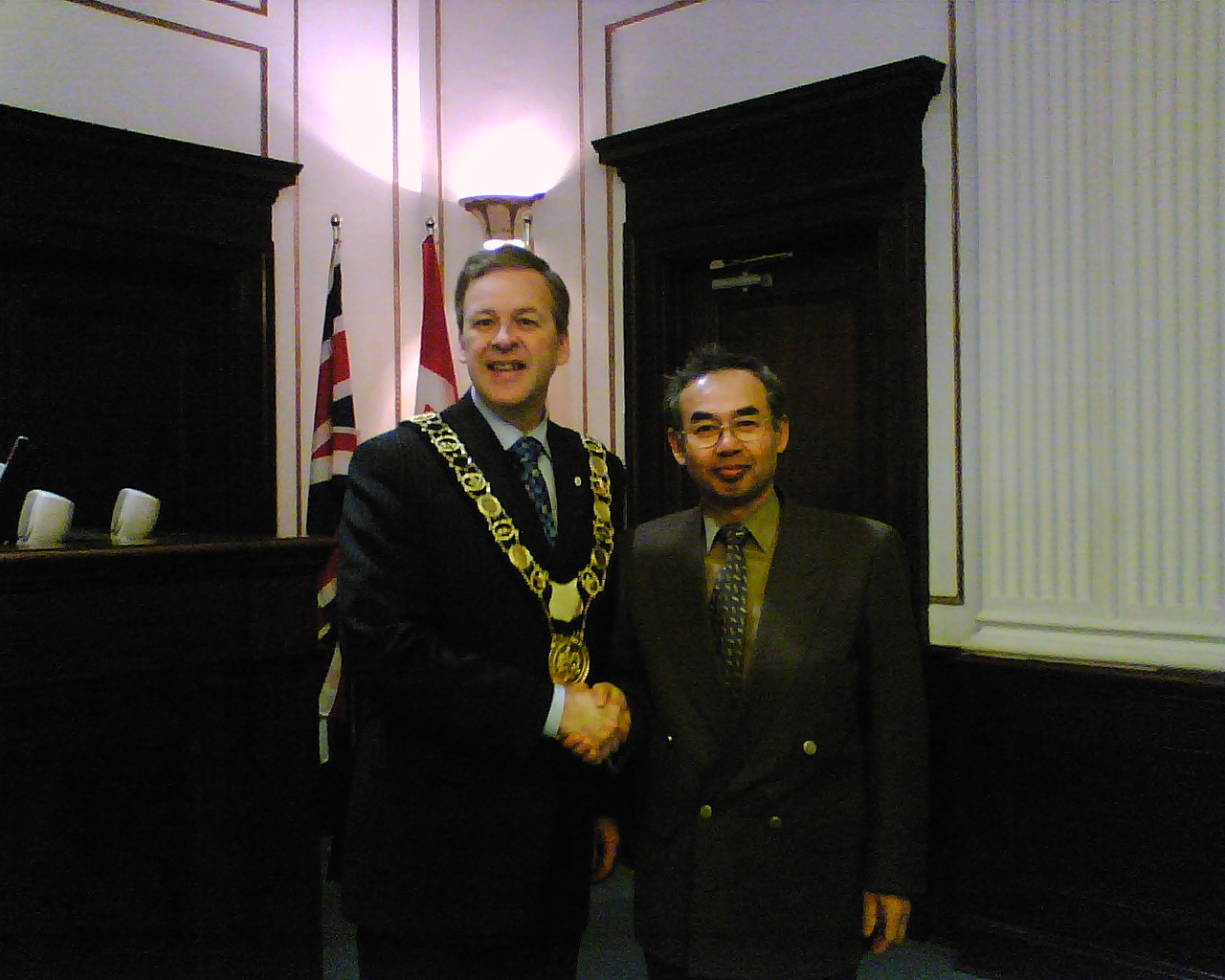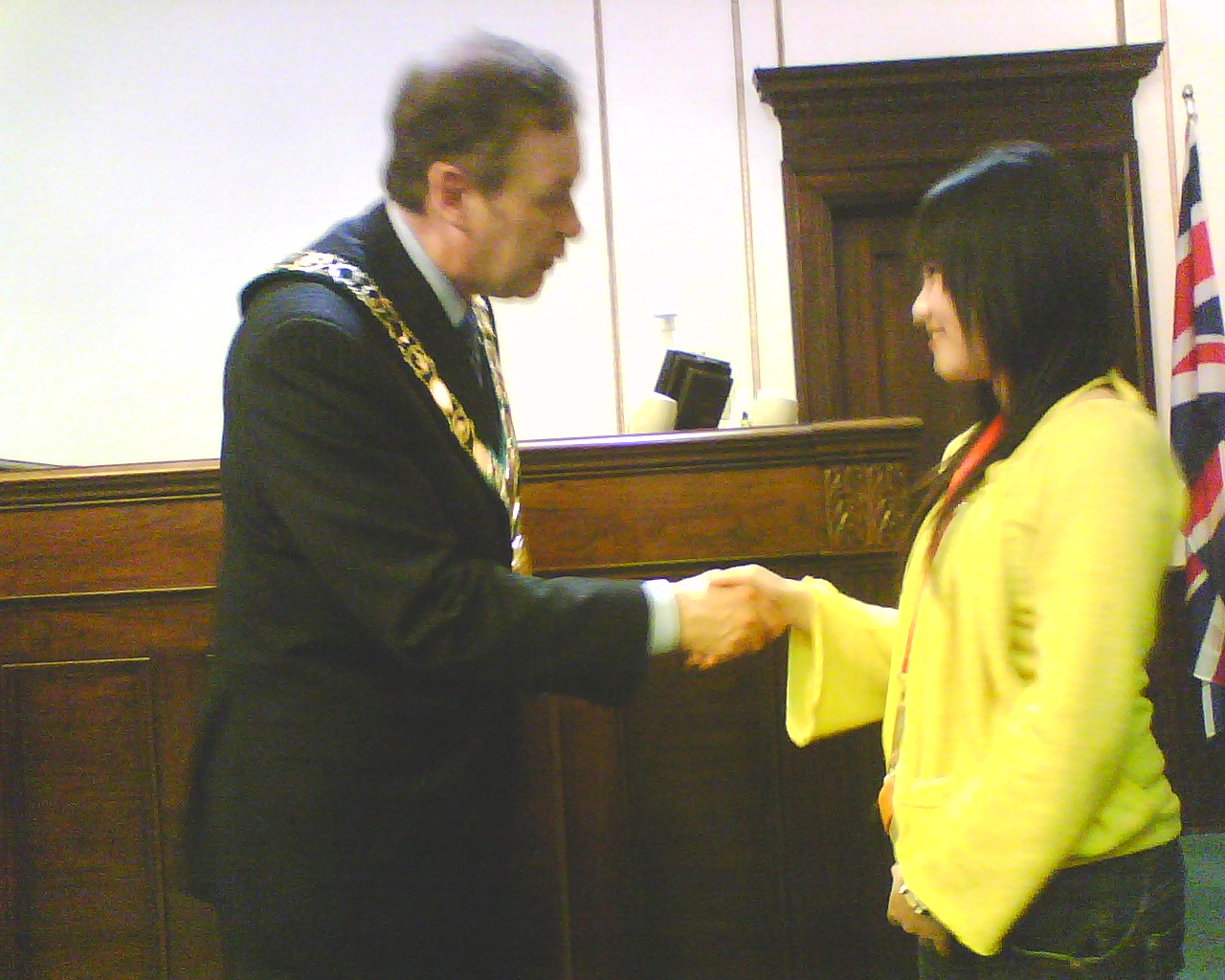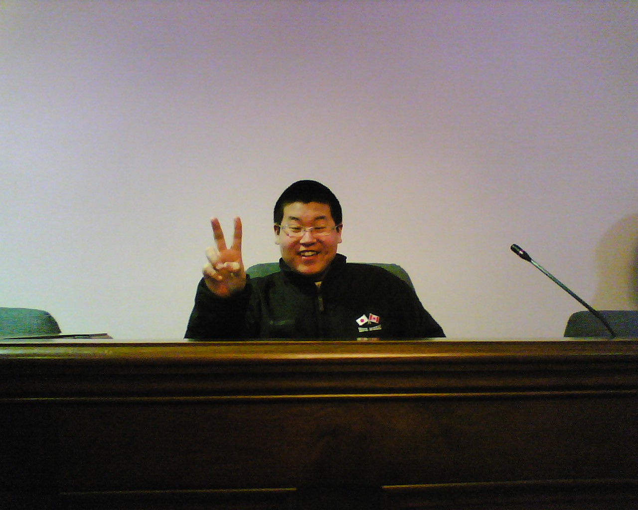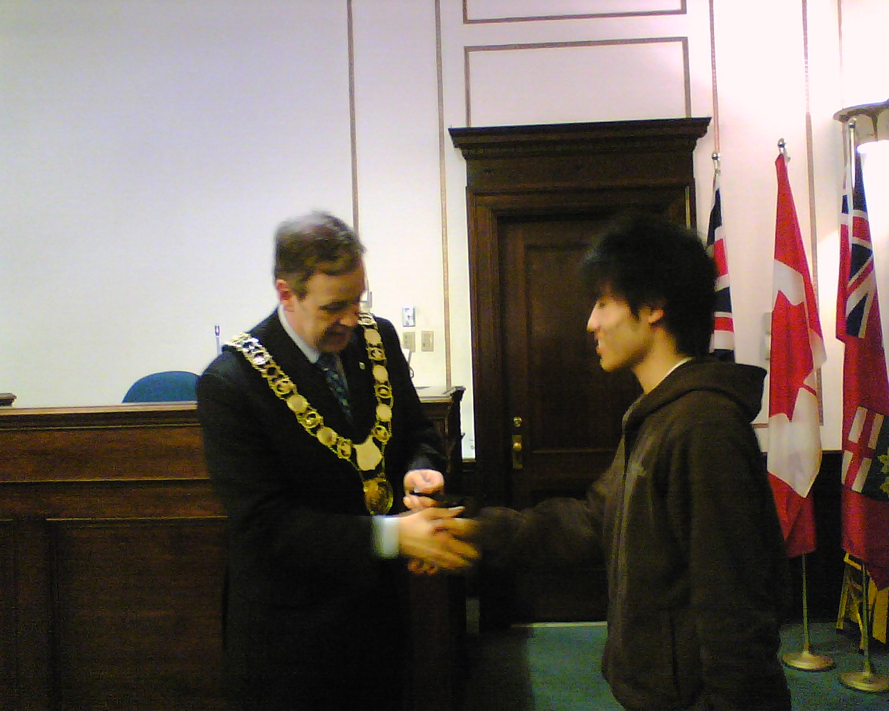 残りは宿題となりました。 放課後は、各自バスターミナルに集合し、セントキャサリンズの市庁舎 に市長を訪問しました。市長の Brian McMullan さんは、今年着任した ばかりの方でしたが、とても優しく思いやり深く北海生に接していただき ました。 記念品として、生徒一人一人にセントキャサリンズの市名が刻 まれたボールペンとバッジが市長の手から渡されました。 また、お別れの前に、市長さんから、「大変素晴らしい生徒たちです」と お褒めの言葉をいただき、日本語で「サヨナラ」の言葉を贈っていただき ました。 バスターミナルで13:40頃、一度解散し、再度6:15にペン・センターの 映画館前に集合し、七つの映画の中から好みの映画を選び、終了次第 解散という形をとりました。 ホストファミリーが迎えに来る場合もあれば、 各自バスを利用し帰宅しました。 終了時間は、概ね9:00でした。 市長さんとお会いする前の ひと時 私は緊張していましたが、 生徒たちは、意外に落ち着 いています。 こうして一人一人握手をして 記念品が手渡されました。 舟橋江梨伽 握手は、手をしっかり握るのが 大切な礼儀です。 高木理沙 斉藤隆馬は、少々緊張気味 鈴木悠希は、市長さんに 気に入られたようです。 岡部彩華は、いかにも 嬉しそう 何か、親子の雰囲気 斉藤愛菜 いつも落ち着いています。 戸田智美 どちらが年長? Meg 先生 かなりブレました。 ゴメン 議長席の前に 全員集合 ちゃっかり議長席に 鈴木悠希 議長?を囲んで 市庁舎前で 映画は、字幕が無いので楽しめたかどうか。 明日は、希望者のみ9:00から中心街でショッピングをすることに なっています。大半が希望しました。 10:00に全員集合して、メイプル・シュガーの森を散歩したり、メイ プルシロップ製品のショッピングをする予定です。 ※ 市長を訪問した時の反省として、対市長さんへの贈り物として何 か適当な物を考えておくべきだと思いました。 今回は、北海のマ ークの入ったキーホルダーを差し上げたのですが、市長からの もてなしからして、適切ではなかったようにも思えました。